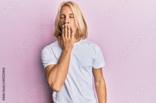 Caucasian young man with long hair wearing casual white t shirt bored yawning tired covering mouth with hand. restless and sleepiness.