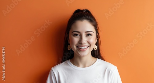 caucasian young woman orange background wearing plain white tshirt smiling happy portrait