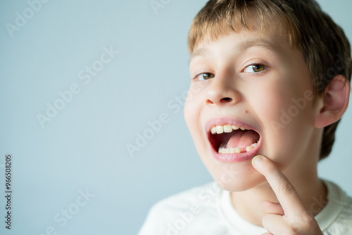 Change of milk teeth. 10 year old boy holds his face with his hand and shows his mouth. House.