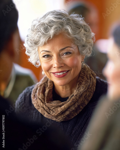 Charismatic mature woman with silver hair at social gathering, Elegant philanthropist lifestyle portrait