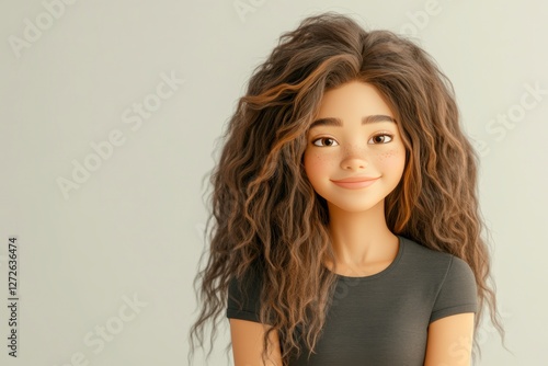 Charming animated character with long curly hair smiling against a soft pastel background in a casual outfit
