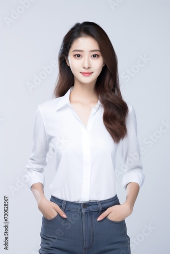 Charming Asian Employee, In a striking portrait, a young Asian businesswoman emanates elegance and professionalism against a simple white background. Generative AI.