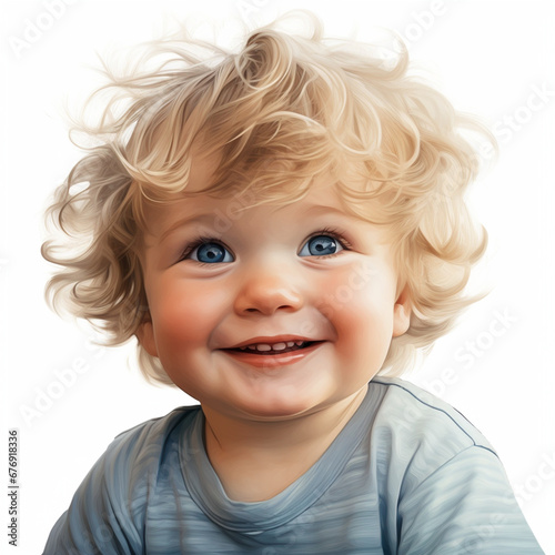 charming boy with blond hair,wearing a blue T-shirt, smiling sweetly, on a white background, illustration,watercolor