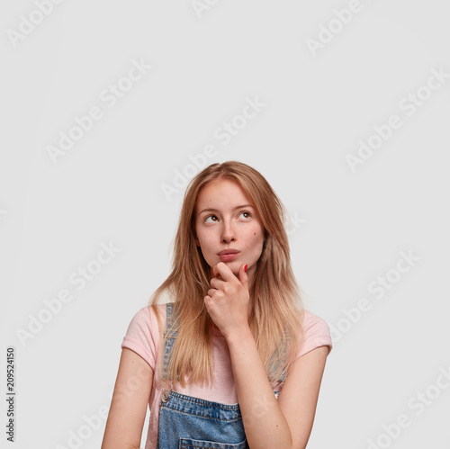 Charming Caucasian female with light hair, picks something in mind, thinks as needs to make difficult choice, dressed in fashionable denim overalls, isolated over white blank wall, holds chin