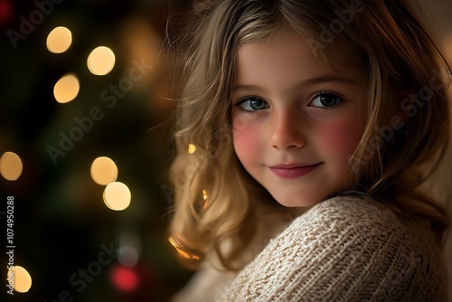 Charming Girl in Knit Sweater Smiling Warmly with Festive Holiday Lights Behind Her : Generative AI