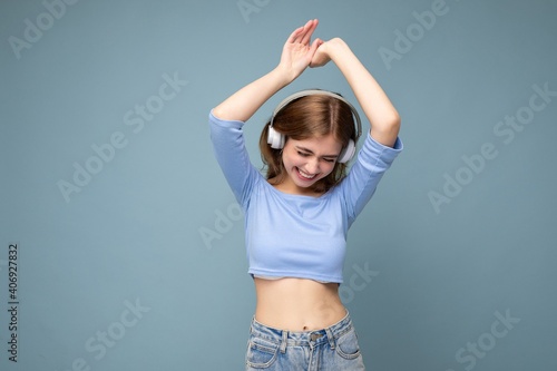 Charming happy smiling young blonde woman wearing blue crop top isolated on blue background wearing white wireless bluetooth headphones listening to good music and dancing