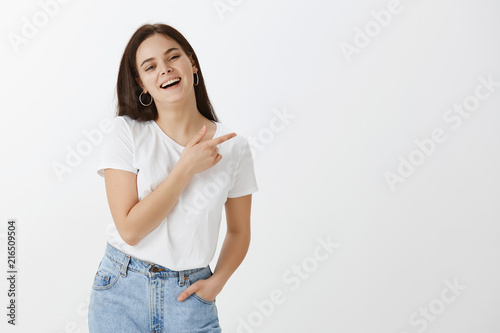 Charming hot and stylish dark-haired female in stylish street style outfit, holding hand in pocket and pointing right with forefinger, laughing joyfully, standing happily over gray background