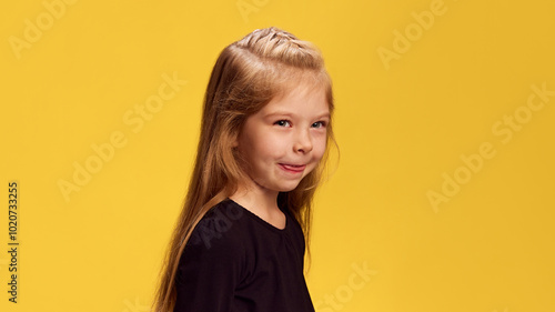 Charming little girl playfully sticks out her tongue, with mischievous expression looks at camera against yellow studio background. Concept of children's emotions, childhood, expression. Ad