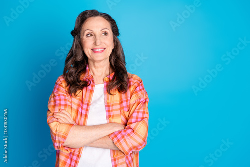 Charming mature woman with a friendly smile wearing a checkered shirt and crossing arms against a bright blue background