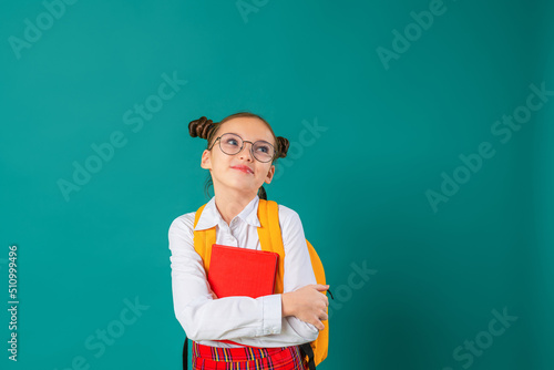 charming mischievous little girl in a school uniform with glasses, smiling at the camera and holding a book in her hands, having fun during school classes on a green background. Back to school.