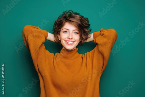 Charming Model in Green Tee, Radiating Confidence Against a Vibrant Backdrop