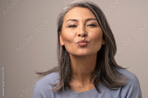 Charming Mongolian Woman with Gray Hair Over a Gray Background.