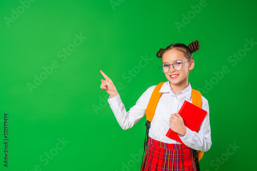 charming naughty schoolgirl in school uniform and glasses, pointing with her finger. A girl smiling at the camera and holding a book in her hands demonstrates a green copy space. Back to school.