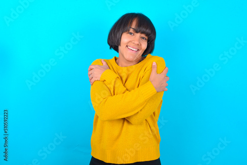Charming pleased young brunette woman with short hair wearing yellow knitted sweater over blue background embraces own body, pleasantly feels comfortable poses. Tenderness and self esteem concept