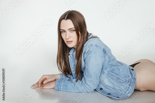 Charming, sensual and seductive long-haired woman in jeans denim jacket and black tight body. Perfect body and skin care