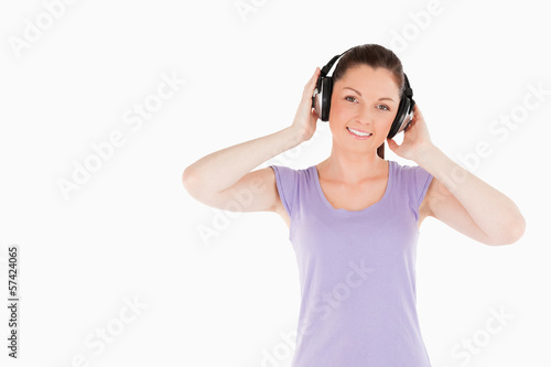 Charming woman posing with headphones while standing