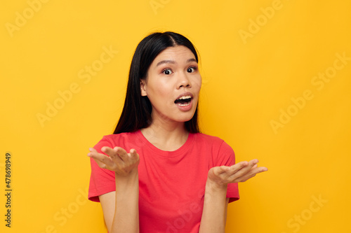 Charming young Asian woman in a red t-shirt posing emotions fun isolated background unaltered