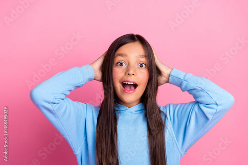 Charming young girl in blue hoodie with surprised expression posing against pink background