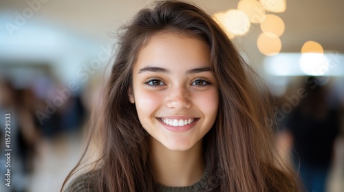 Charming young girl with long brown hair and bright smile standing in a bustling indoor setting during the day