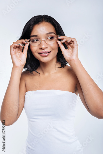 Charming young woman touching rims of eyeglasses
