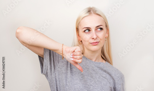 Charming young woman with creative hairstyle is posing and shows her big finger down.