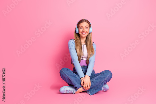 Charming young woman with headphones enjoying leisure time against a pastel pink wall, showcasing trendy casual fashion