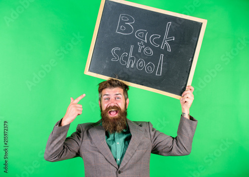 Check this out. Back to school special offer. Special offer discount and sale school season. Offer for pupils. Man bearded teacher holds blackboard back to school inscription on green background