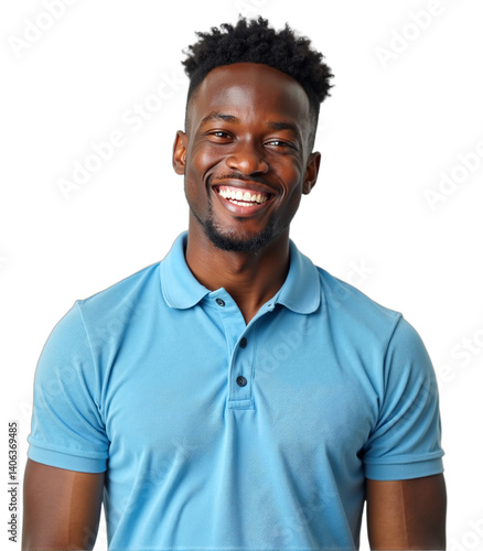 Cheerful African American man portrait Isolated on transparent background. Smiling, wearing blue polo, ideal for corporate, diversity campaigns, healthcare, and education.