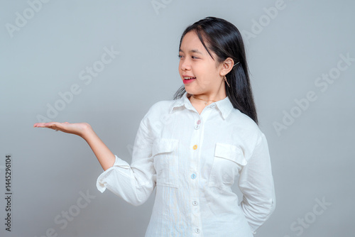 Cheerful Asian girl in white shirt smiling while pointing sideways with open palm, looking at her hand with excited expression, suggesting product placement, isolated on gray background.