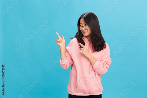 Cheerful Asian student young lady in pink hoodie sweatshirt wear round glasses point fingers aside posing isolated on over blue background. The best offer for ad. Eyewear for vision correction concept
