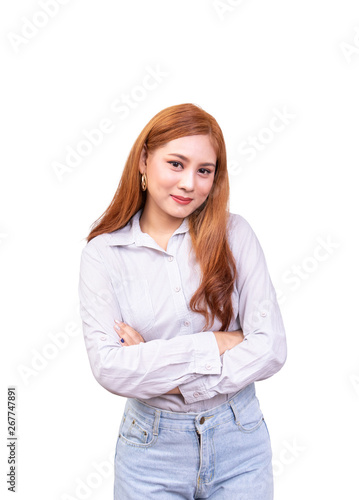 cheerful Asian woman cross one's arm, tilting her necks and smiling isolated on white background with clipping path. studio portrait of beautiful female model with long hair