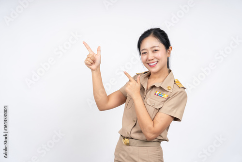 Cheerful Asian woman in brown Thai government uniform pointing up with both hands standing on white background