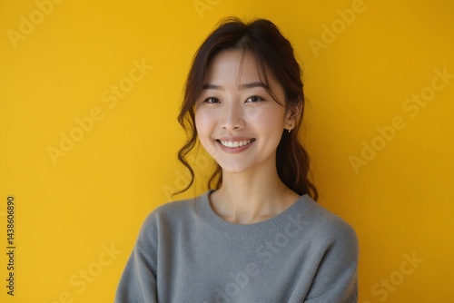 Cheerful Asian Woman in Cozy Grey Sweater Smiling, Studio Portrait with Plain Yellow Backdrop