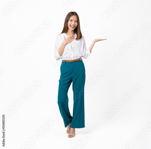 Cheerful beautiful Asian women show hands with open palms on side isolated on white background.