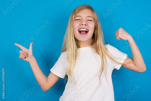 Cheerful beautiful Caucasian little girl wearing white T-shirt over blue background showing copy space ad celebrating luck