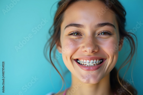 Cheerful beautiful young woman with braces on teeth isolated over blue background. AI