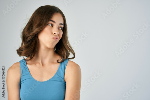 cheerful brunette fashion hairstyle blue tank top lifestyle