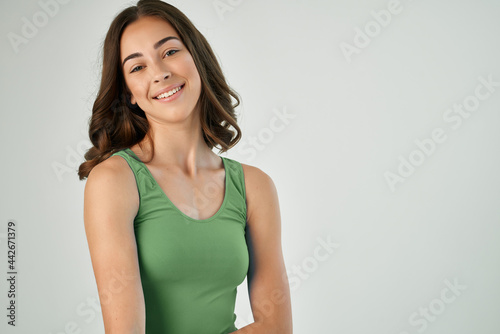 cheerful brunette holding her hair green wash smile posing