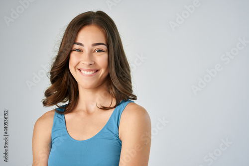 cheerful brunette in blue t shirt fashion hairstyle basing isolated background