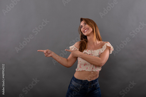 Cheerful brunette model dressed in casual clothes smiles and points sideways with finger isolated on gray background
