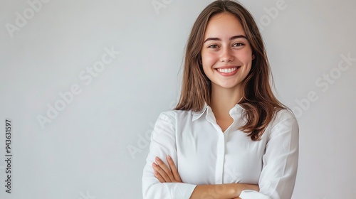 Cheerful business woman student in white button up shirt, smiling confident and cheerful with arms folded, isolated on a white background
