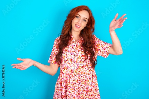 Cheerful Caucasian redhead woman wearing floral dress over blue background making a welcome gesture raising arms over head.