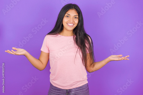 Cheerful cheery optimistic Hispanic brunette girl wearing pink t-shirt over purple background holding two palms copy space