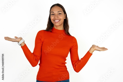 Cheerful cheery optimistic Young beautiful woman holding two palms copy space