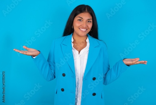 Cheerful cheery optimistic Young latin woman wearing blue blazer blue background holding two palms copy space