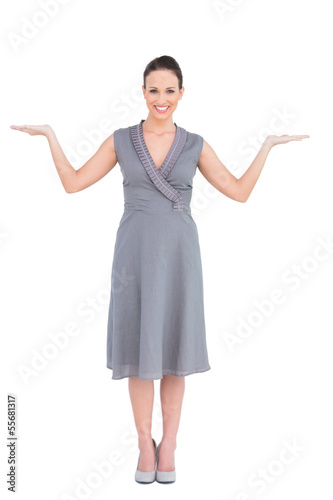 Cheerful elegant woman in classy dress posing hands up