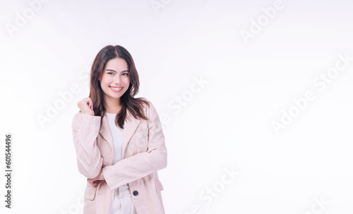 Cheerful excited successful business woman raise fist fight worker standing over isolated white background. Success young asian mixed race girl holding raise fist smiling expression positive on white.
