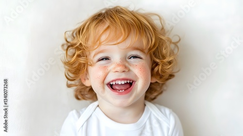Cheerful freckle faced child with vibrant curly hair laughing happily against a clean bright white background