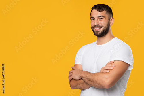 Cheerful friendly confident mature caucasian man in white t-shirt with crossed arms on chest