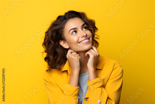 Cheerful Girl in a Reflective Moment, Captured Against a Vibrant Canvas.